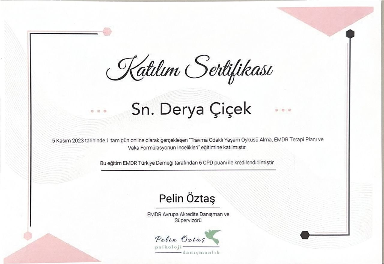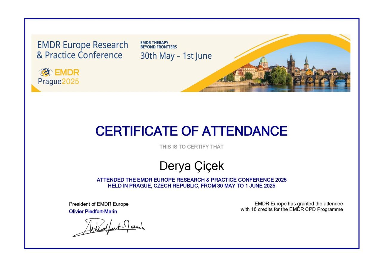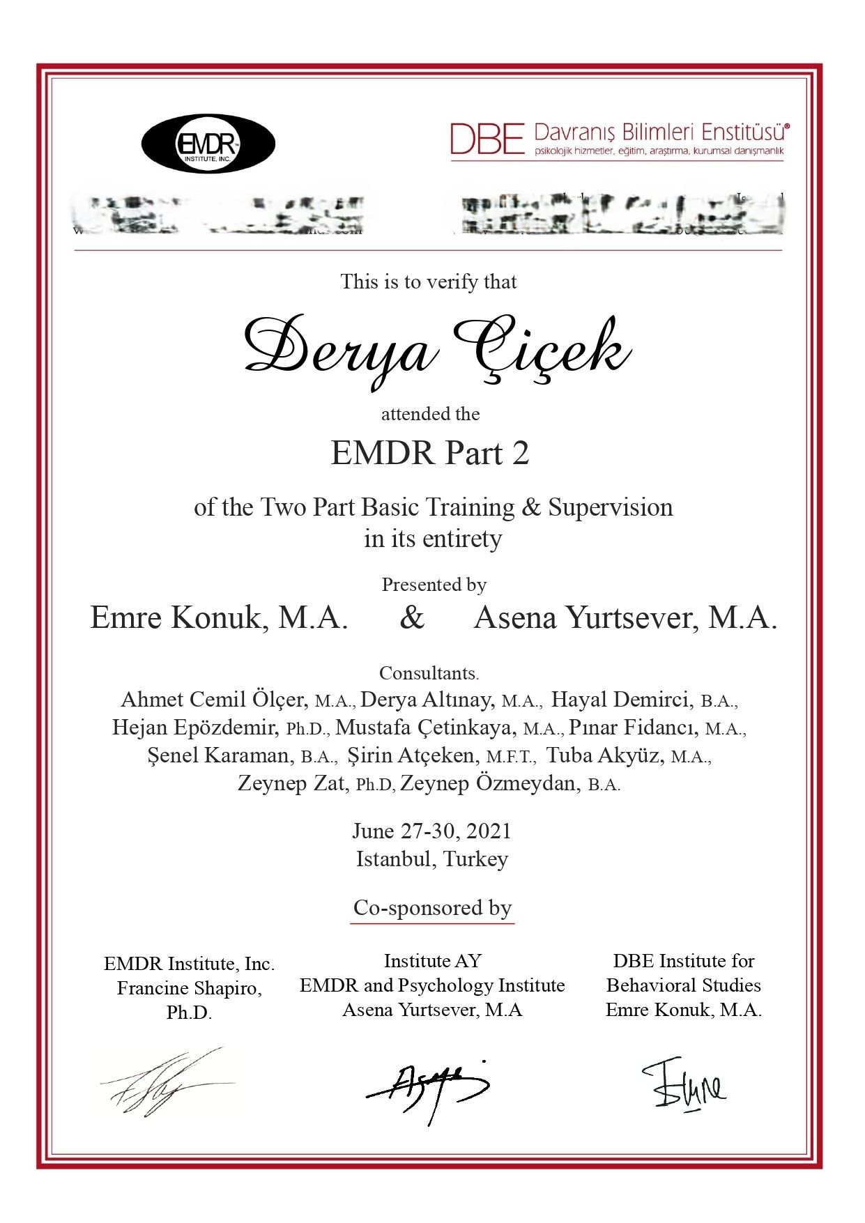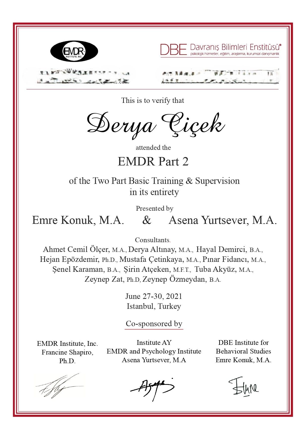 Psikolog Derya Çiçek aynı zamanda EMDR 1. Düzey, EMDR 2 Düzey eğitimlerini aldıktan sonra süpervizyon eğitimlerine devam ederek 2022 yılında EMDR Avrupa Akredite EMDR Terapisti sertifikasını almıştır. 2022 yılından beri EMDR Terapisi alanında yetkin, Avrupa Akredite süpervizör ve eğitimcilerden süpervizyon ve eğitimler almaya devam etmekte, EMDR Avrupa Akredite danışman/süpervizör olma yolunda ilerlemektedir.