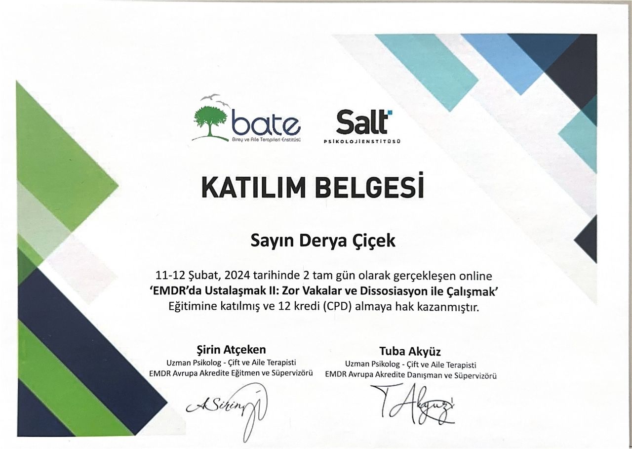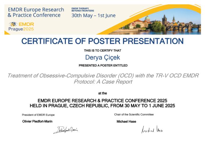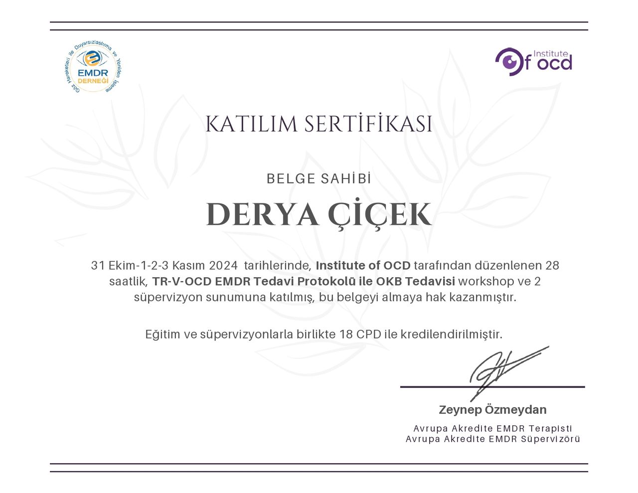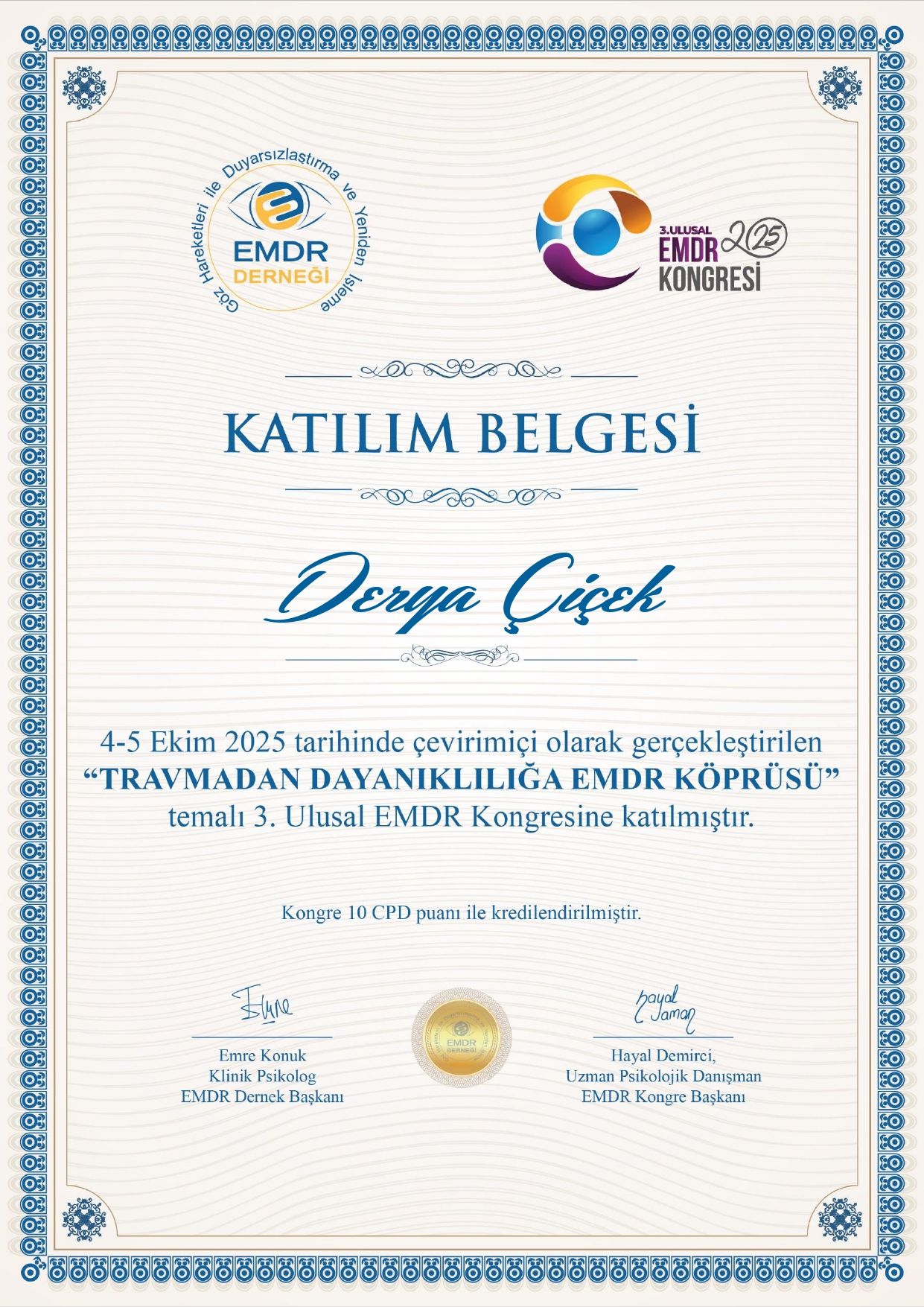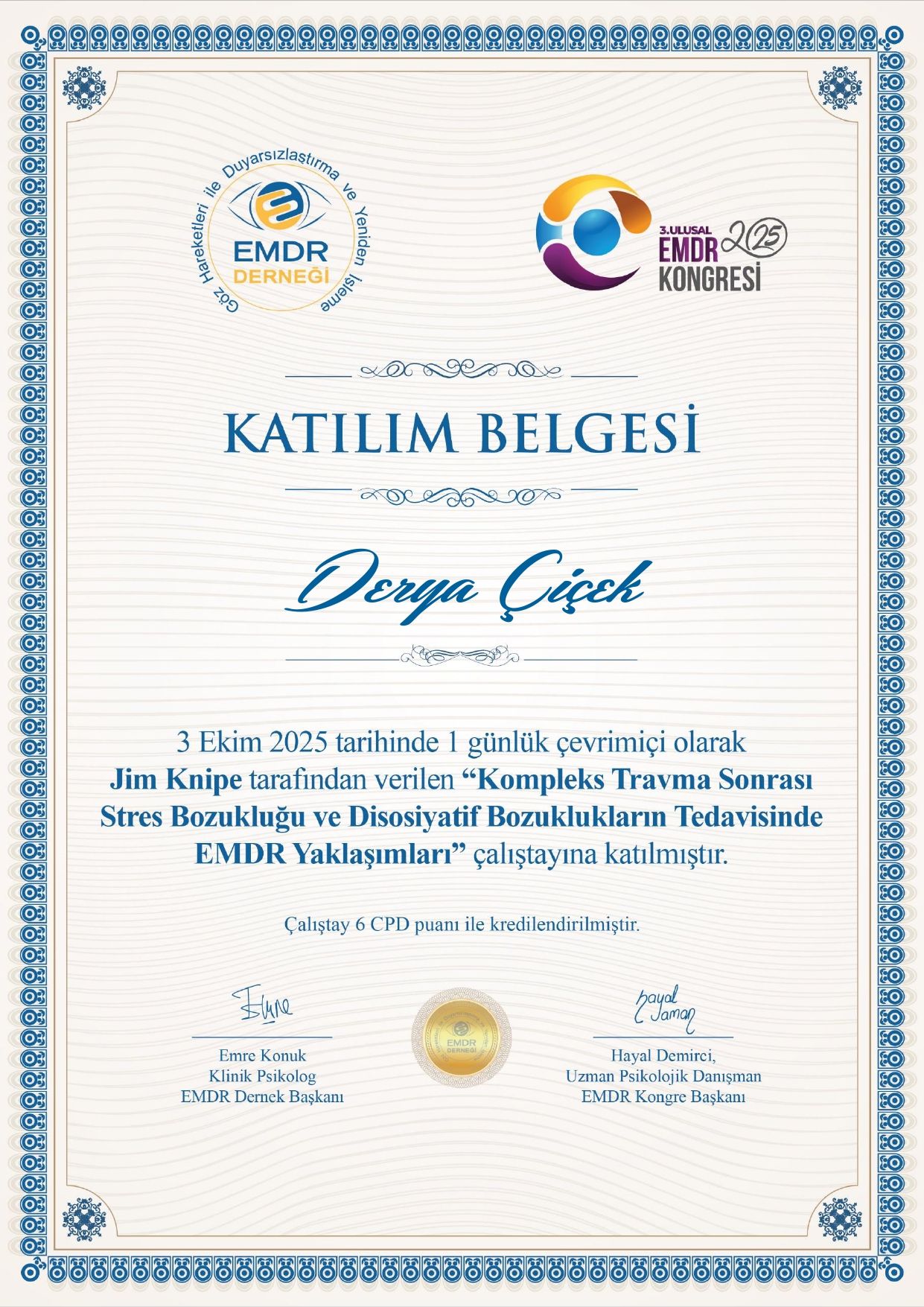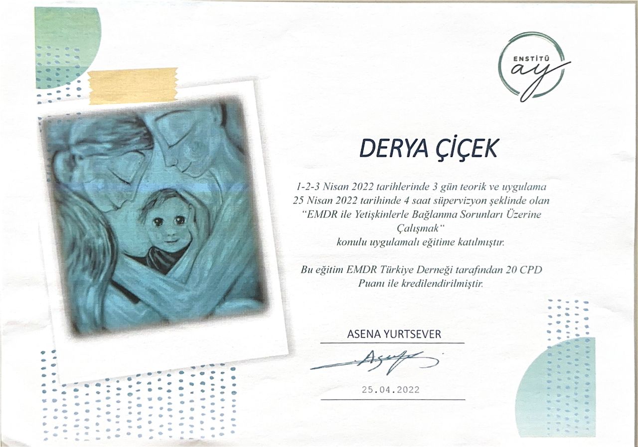 Psikolog Derya Çiçek aynı zamanda EMDR 1. Düzey, EMDR 2 Düzey eğitimlerini aldıktan sonra süpervizyon eğitimlerine devam ederek 2022 yılında EMDR Avrupa Akredite EMDR Terapisti sertifikasını almıştır. 2022 yılından beri EMDR Terapisi alanında yetkin, Avrupa Akredite süpervizör ve eğitimcilerden süpervizyon ve eğitimler almaya devam etmekte, EMDR Avrupa Akredite danışman/süpervizör olma yolunda ilerlemektedir.