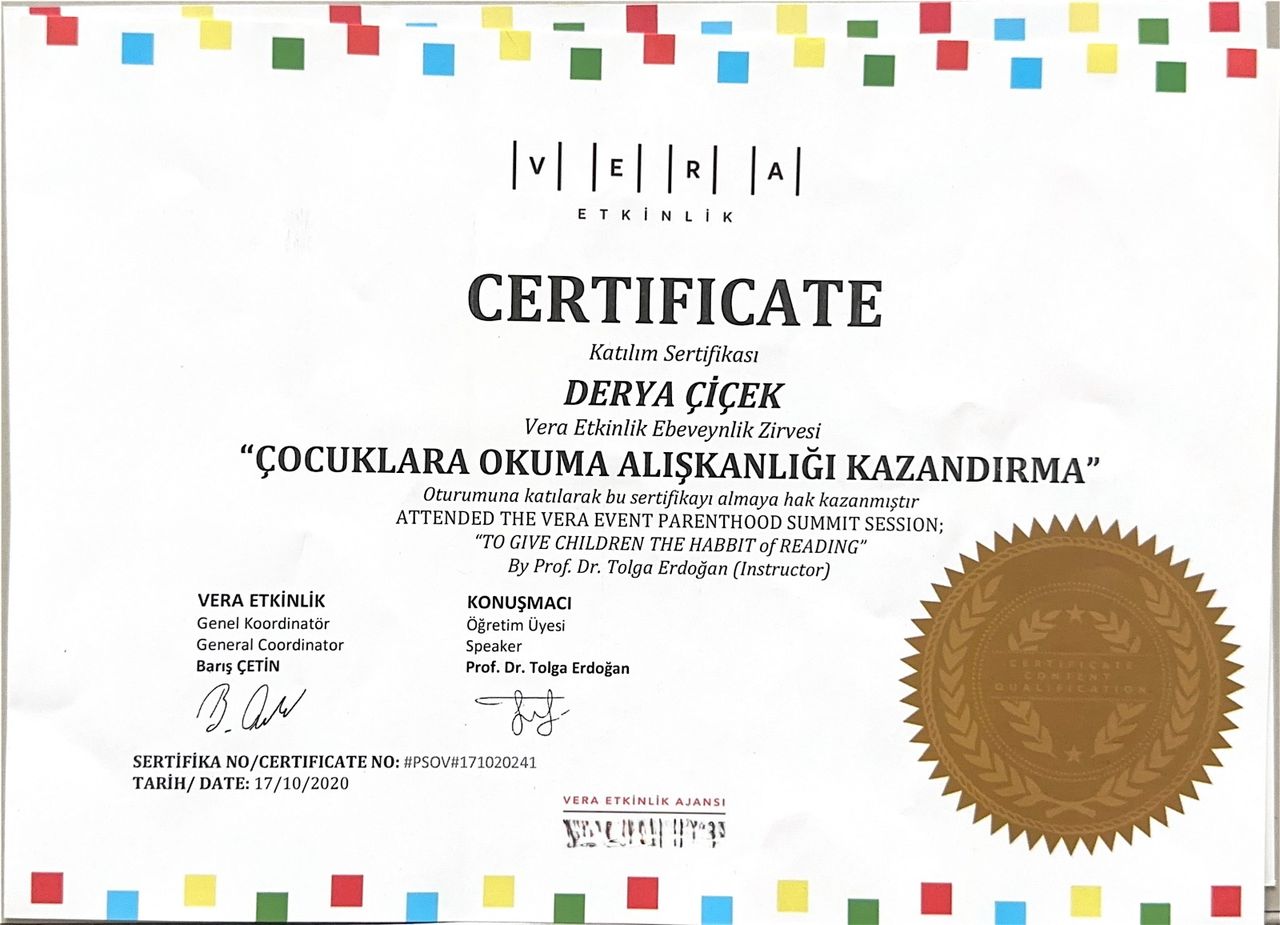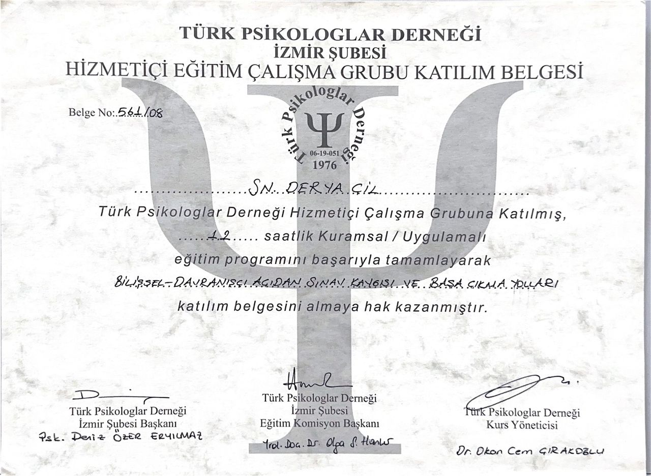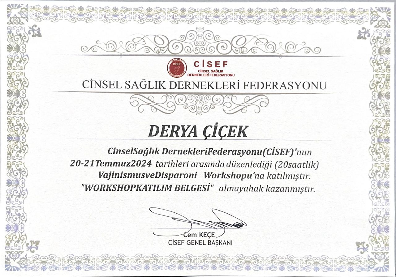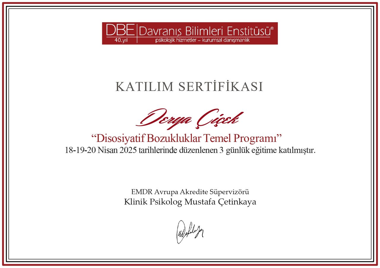 Psikolog Derya Çiçek aynı zamanda EMDR 1. Düzey, EMDR 2 Düzey eğitimlerini aldıktan sonra süpervizyon eğitimlerine devam ederek 2022 yılında EMDR Avrupa Akredite EMDR Terapisti sertifikasını almıştır. 2022 yılından beri EMDR Terapisi alanında yetkin, Avrupa Akredite süpervizör ve eğitimcilerden süpervizyon ve eğitimler almaya devam etmekte, EMDR Avrupa Akredite danışman/süpervizör olma yolunda ilerlemektedir.
