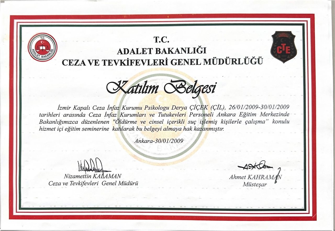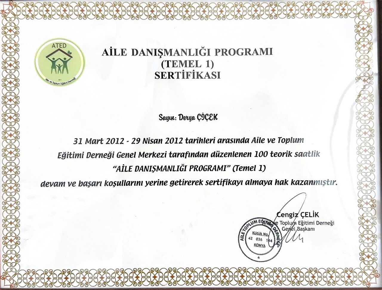 Derya ÇİÇEK ayrıca EGO STATE THERAPY INTERNATIONAL (ESTI) uluslararası eğitmeni Dr. Waltemade Hartman’dan Ego State Terapi Eğitimi’ne devam etmektedir. Bu eğitim sonunda ESTI onaylı, dünya çapında geçerli, uluslararası akredite sertifikalı Ego State Terapisti olacaktır.